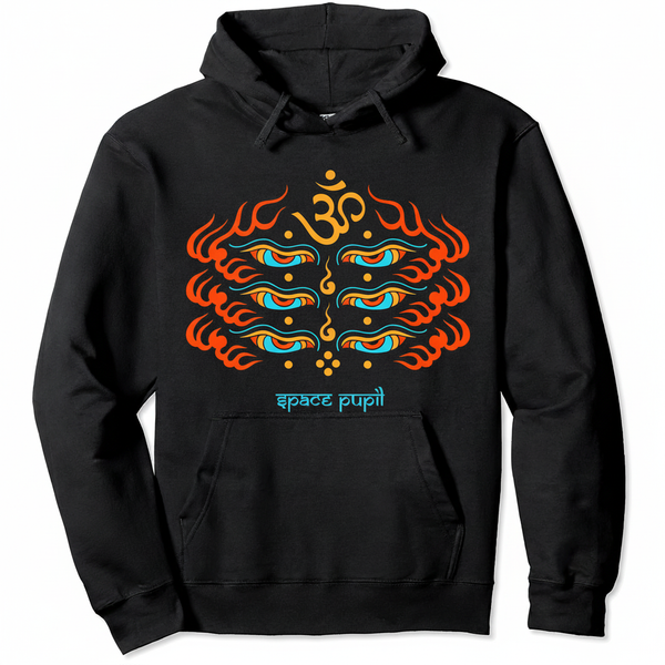 Wear your consciousness. This heavyweight black hoodie features GUNGA MA's mesmerizing Om Eyes design—three stacked rows of all-seeing eyes crowned with a sacred Om symbol, flanked by orange Tibetan flames and swirling cosmic energy.
