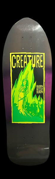 This one’s a rare gem—featuring a hand-painted look with a killer stain fade and the ominous Burn Witch Burn graphic. A true relic with a shape reminiscent of early Dressen decks, built for smooth cruising or adding some serious heat to your collection. The exact release date is elusive, but one thing’s for sure—this deck is sick.